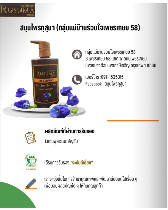 สมุนไพรกุสุมา กลุ่มแม่บ้านร่วมใจเพชรเกษม 58 แชมพูสระผมอัญชันCEC07/25663 ธันวาคม 2566